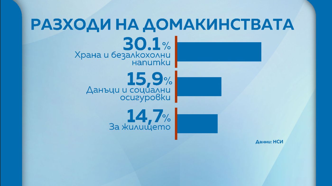 В структурата на общия разход с най-голям относителен дял са разходите за храна и безалкохолни напитки (30.1%), следвани от разходите за данъци и социални осигуровки (15.9%), за жилище (14.7%), и за транспорт и съобщения (11.0%).