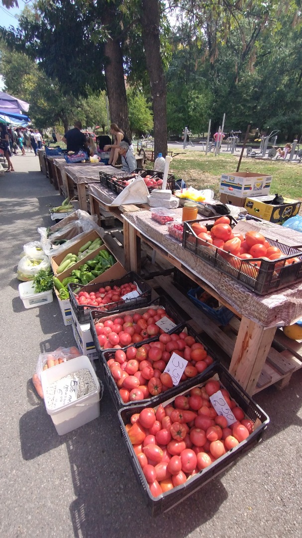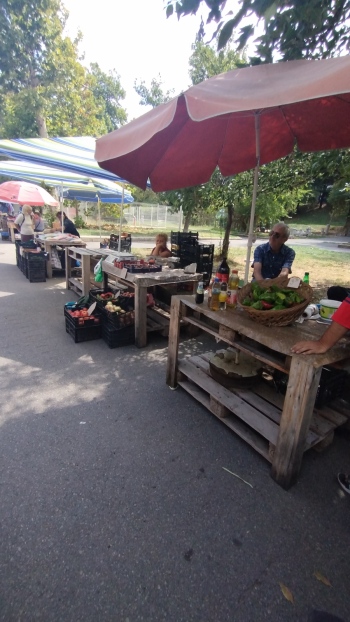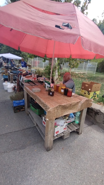 Баби и дядовци с работливи ръце предлагат собствената си, до колкото е възможно - екологично чистапродукция. Сергиите се редуват - домати, чушки, царевички, до тях вълнени чорапи, плетени с любов, чехли и дори грамофонни плочи. Малко по-нататък, върху тротоара, някой е подредил стари книги - без цени. Ако нещо те грабне - питаш. А, от корицата на някое поизносено издание Агата Кристи чака новите си читатели на кюстендилския пазар.