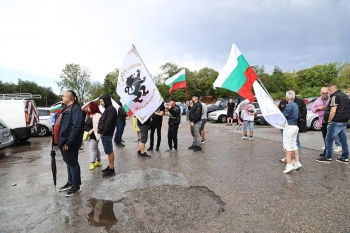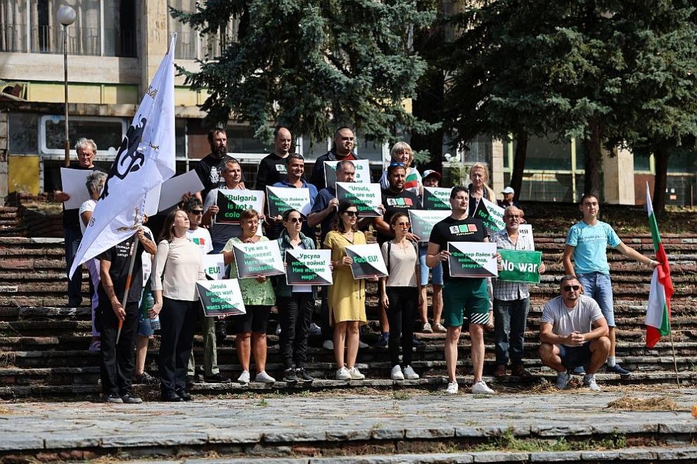 Привърженици на партия "Възраждане" протестират на площада пред "Вазовските машиностроителни заводи" (ВМЗ) в Сопот по повод на предстоящото посещение на премиера Росен Желязков и председателя на Европейската комисия (ЕК) Урсула фон дер Лайен в държавното предприятие.