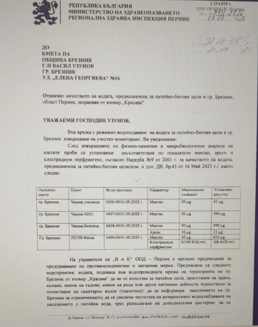 Регионалната здравна инспекция – Перник обяви, че водата от водопроводната мрежа в Брезник не отговаря на изискванията за питейно-битови нужди и не трябва да се използва за пиене, готвене, къпане и хигиенни дейности. Това е резултат от засилен мониторинг на водата, подадена от язовир “Красава“, която захранва града.