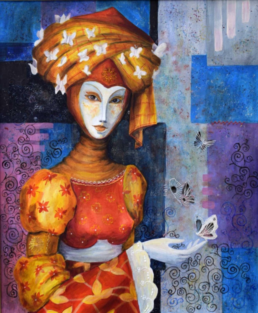 В нея са представени 35 творби (живопис, графика и рисунка), изпълнени в техниките колаж, монотипия и смесена техника. Те са резултат от творческите търсения на авторката през последните няколко години. Живописните композиции разказват истории, а пъстрата им цветност преплита реална и нереална образност на границата на съществуващото и сюреалистичното с подчертано внимание към детайла. Тези историите са вплетени в самите платна, в които живеят - от нежните парчета дантела и по-груби парчета плат, до петната с боя, които украсяват всяка композиция. Фигурите се открояват върху ярки тонове – злато, синьо, оранжево, жълто - все контрасти, които подчертават нежното им излъчване.