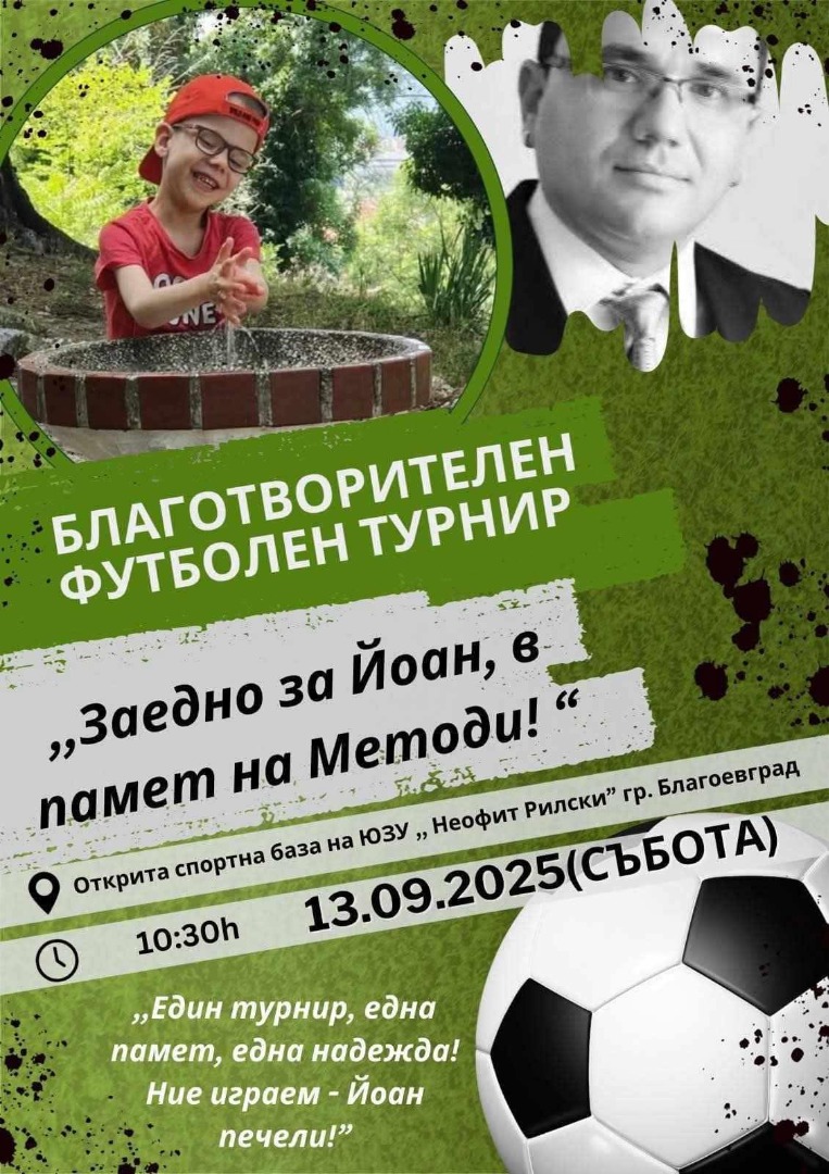 Благотворителен футболен турнир под мотото "Заедно за Йоан, в памет на Методи!“ ще събира средства за лечението на тежко болно дете в Благоевград. Събитието ще се проведе в откритата спортна база на Югозападен университет "Неофит Рилски“ на 13 септември от 10:30 ч. Целта е да се помогне на Йоан Методиев Дерменджиев – дете, което се бори с тежко заболяване още от раждането си. Йоан е още мъничък, но има нелека съдба. Освен, че води битка за живот, той изгуби баща си преди няколко месеца. През юли Благоевград изпрати един от най-обичаните си хора – Методи Дерменджиев, познат на всички като Мето Готиния. Дългогодишен и всеотдаен фен на ЦСКА, човек с огромно сърце, Методи почина внезапно от белодробна емболия в болница, където бе постъпил заради проблеми с панкреаса. "Отиде си твърде рано и остави след себе си две прекрасни момчета, които сега ще растат без баща. Методи беше известен не само с любовта си към любимия отбор, но и с това, че винаги помагаше на хората около себе си – тихо, с уважение и човещина”, казват негови приятели. Днес животът поставя неговото семейство пред изпитание, с което той мечтаеше да се справи рамо до рамо с най-малкия си син Йоан.