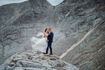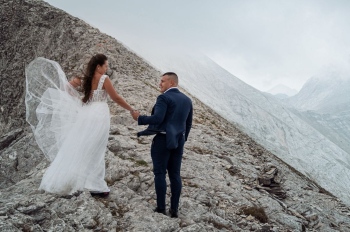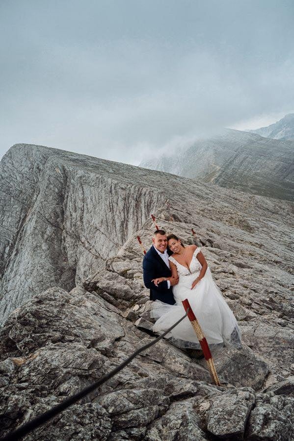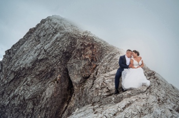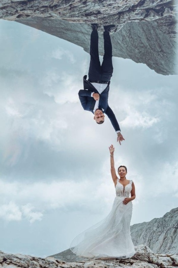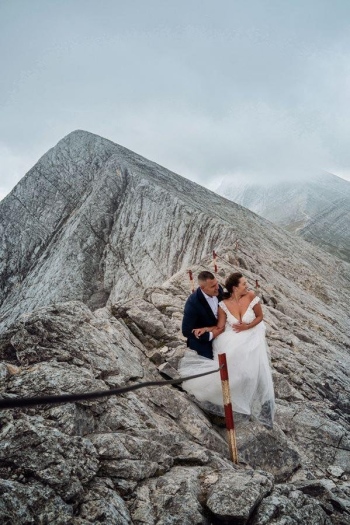 Уникална по рода си сватбена фототесия от ръба на Кончето в Пирин смая погледите и вдигна адреналина на хиляди потребители в социалните медии. Семейната целувка на двамата влюбени Деси и Станимир е уловена в кадър на 2 810 метра надморска височина.