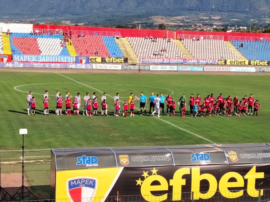 Дупничани започнаха добре и в началото отправиха няколко удара към вратата на противника. В 20-ата минута Симеон Вешев бе близо до откриване на резултата, но шутира встрани от целта. В 34-ата минута удар на Християн Джаджаров бе отразен от вратаря Венцислав Димитров. Малко по-късно и Юлиан Ненов пробва мерника си, но отново стражът се намеси. Така се стигна до 41-ата минута, когато 16-годишният Даниел Кирилов заби фамозен гол за 1:0 с удар от воле от 20-ина метра.