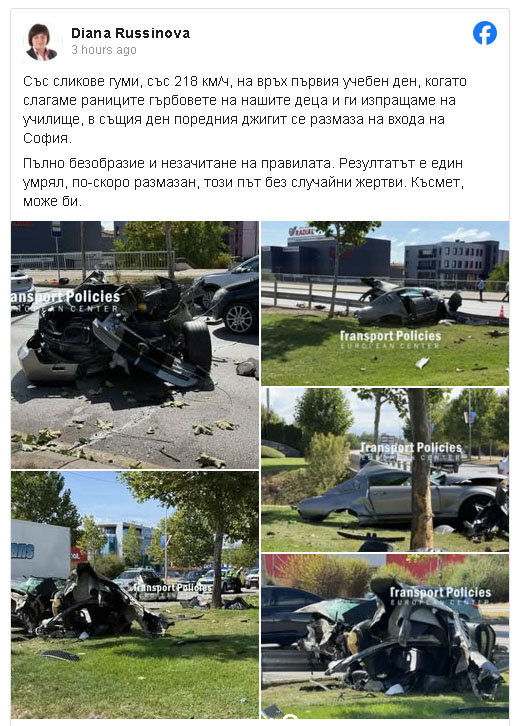 Според Диана Русинова от Европейския център за транспортни политики преди да катастрофира, колата се е движела с 218 км/ч. Освен това автомобилът е бил със слик гуми. Те са за сухо време с гладка повърхност (без шарки). Дават максимално сцепление и висока скорост в завой на болидите. Използва се в състезанията от Формула 1 и други моторни спортове./НОВА