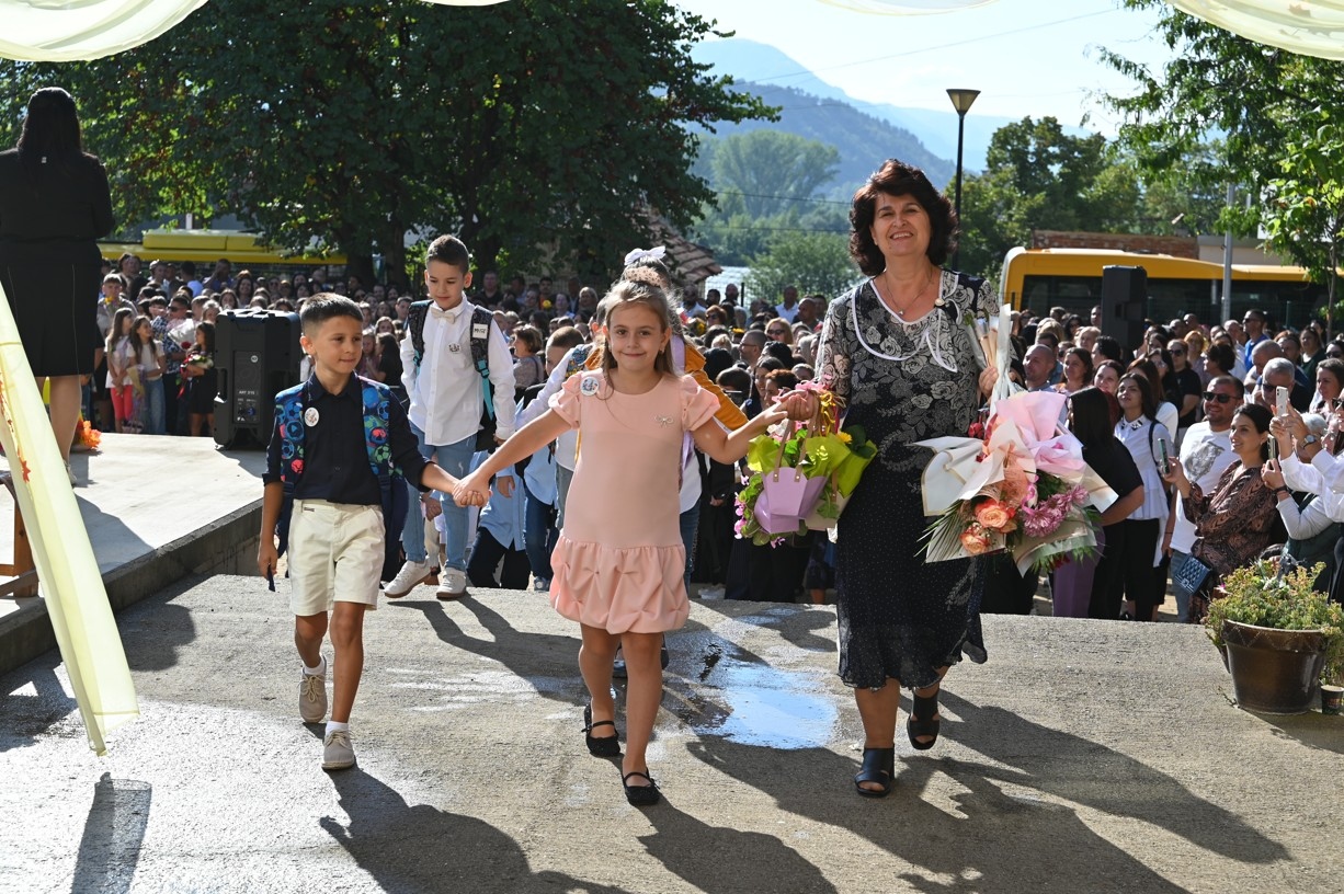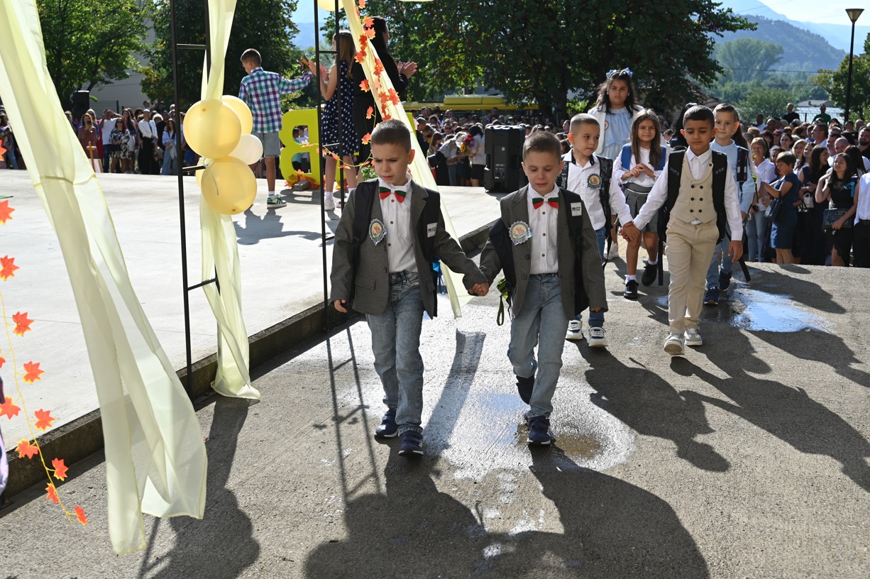 За най-малките възпитаници бе подготвена кратка музикално-танцова програма, а според традицията – “за да им върви по вода“ – менче с вода бе лиснато пред тях, за да поемат смело към своите класни стаи.