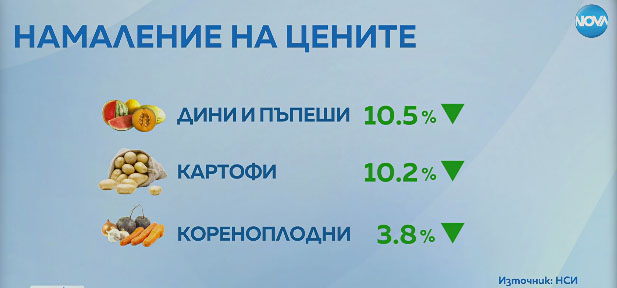 По отношение на потребителските цени - увеличение има при цените на краставиците, пипера и ябълките. Поевтинели са дините и пъпешите, картофите и кореноплодните зеленчуци./БТА