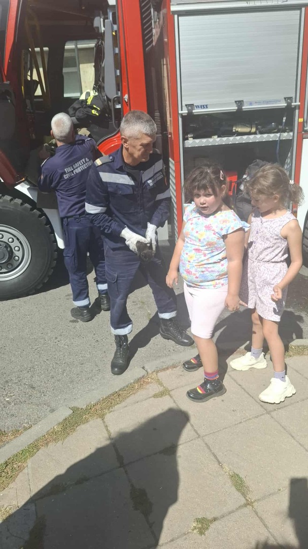 Децата получили и награда за проявената им отговорност-снимка за спомен с огнеборците от РСПБЗН- Кюстендил, отряд Дупница.Спасеното коте вече е част от местната пожарна команда.