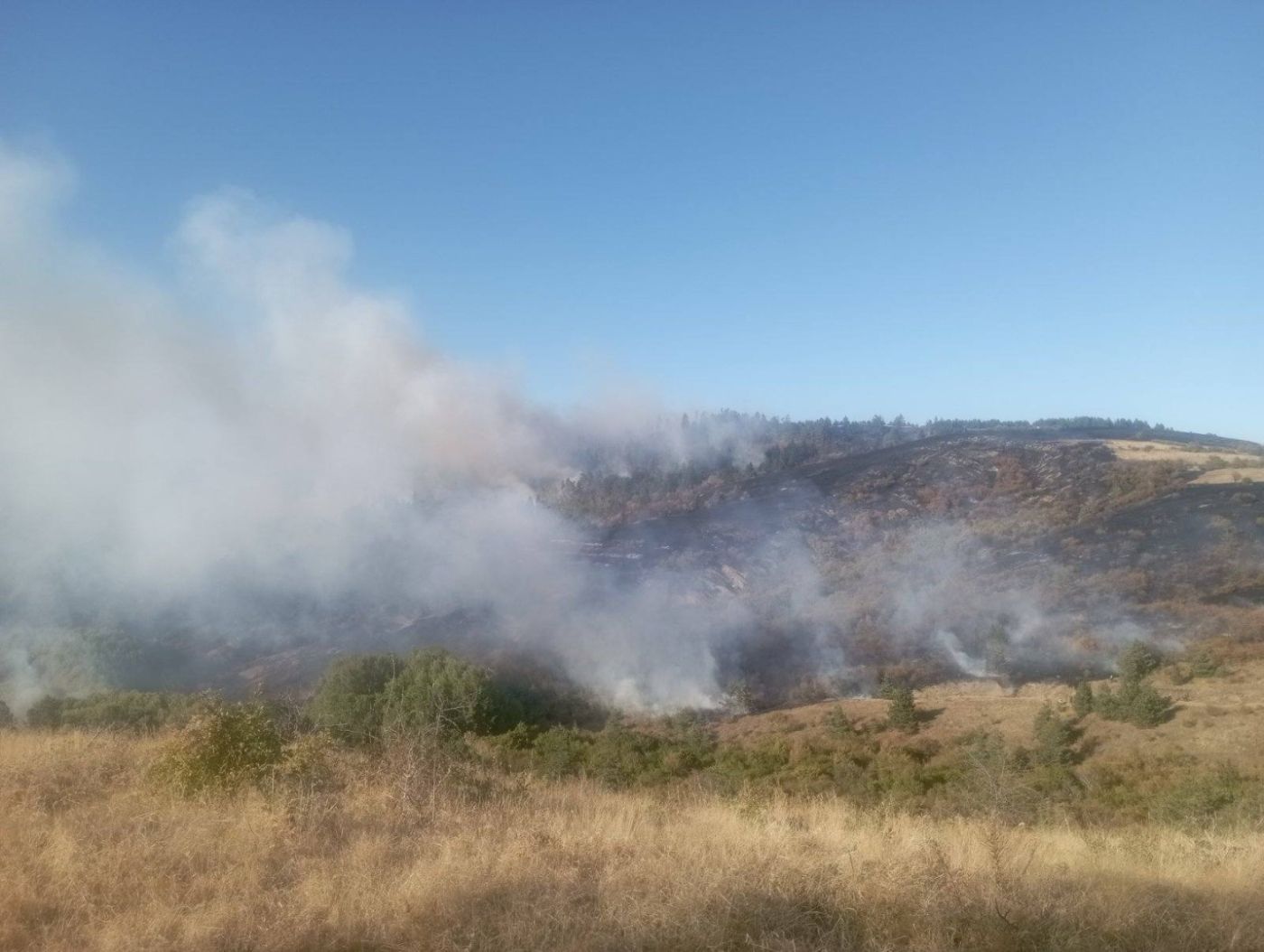 Около 500 декара сухи треви и храсти и 120 декара гора - бял и черен бор са засегнати от пожар над брезнишкото село Горни Романци, съобщиха от ЮЗДП.
