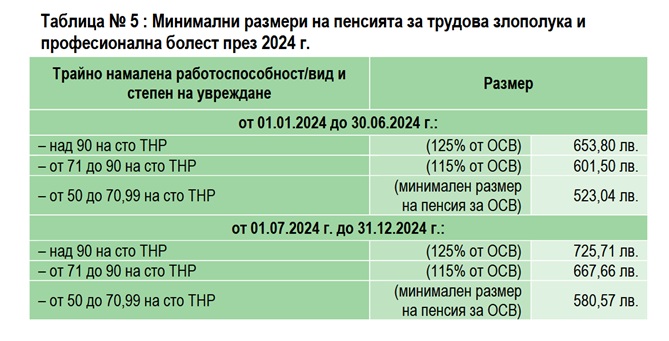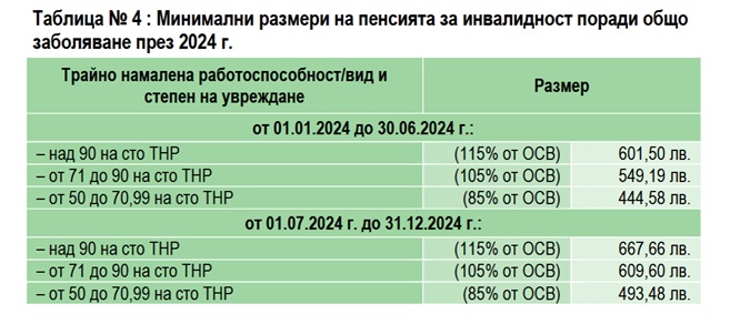 В края на 2024 г. са изплащани 453 334 бр. лични пенсии за инвалидност, като броят им се е увеличил с 22 874 пенсии или с 5,3% в сравнение с 2023 г. (430 460 бр.).