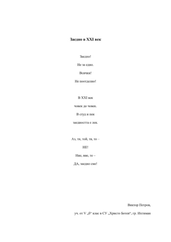 Шестокласникът Виктор Петров от СУ “Христо Ботев“ в Ихтиман, завоюва второ място в Международния ученически конкурс “Заедно в XXI век“. Възпитаникът на ихтиманското училище се отличи в категория “Поезия“ (възрастова група 5–7 клас), където заинтригува журито със своя талант.