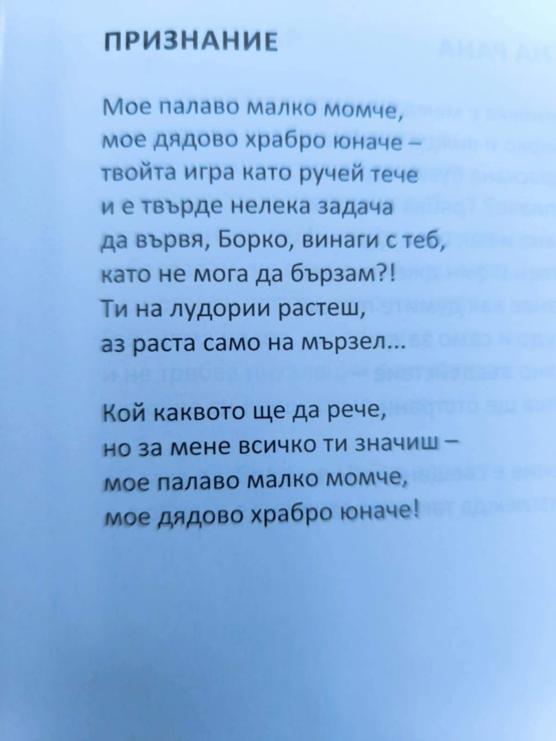 - Посланието е: мили деца, грижовни родители, баби и дядовци - живейте в диалог едни с други, много е важно и човеколюбиво, та нали детето е малкият голям човек. Освен поетът Иван Матанов, единият ми рецензент, и другият, също голям поет - Лъчезар Лозанов, пише, че дядо и внук растат заедно в диалог, учейки се взаимно.