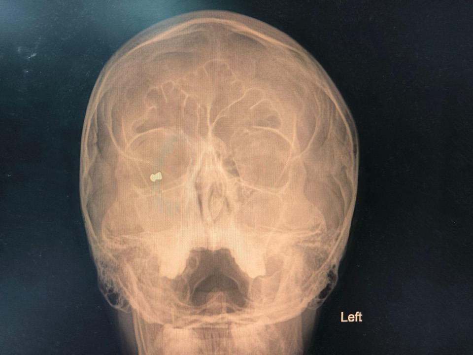 Той е бил приет по спешност в болницата с тежка очна травма. При прегледа е установено метално чуждо тяло в орбитата на дясното око, както и разкъсна рана на клепача, съответстваща на входно отвърстие от прострелване. Зрението му към момента на приемане е било силно намалено – до броене на пръсти пред окото.