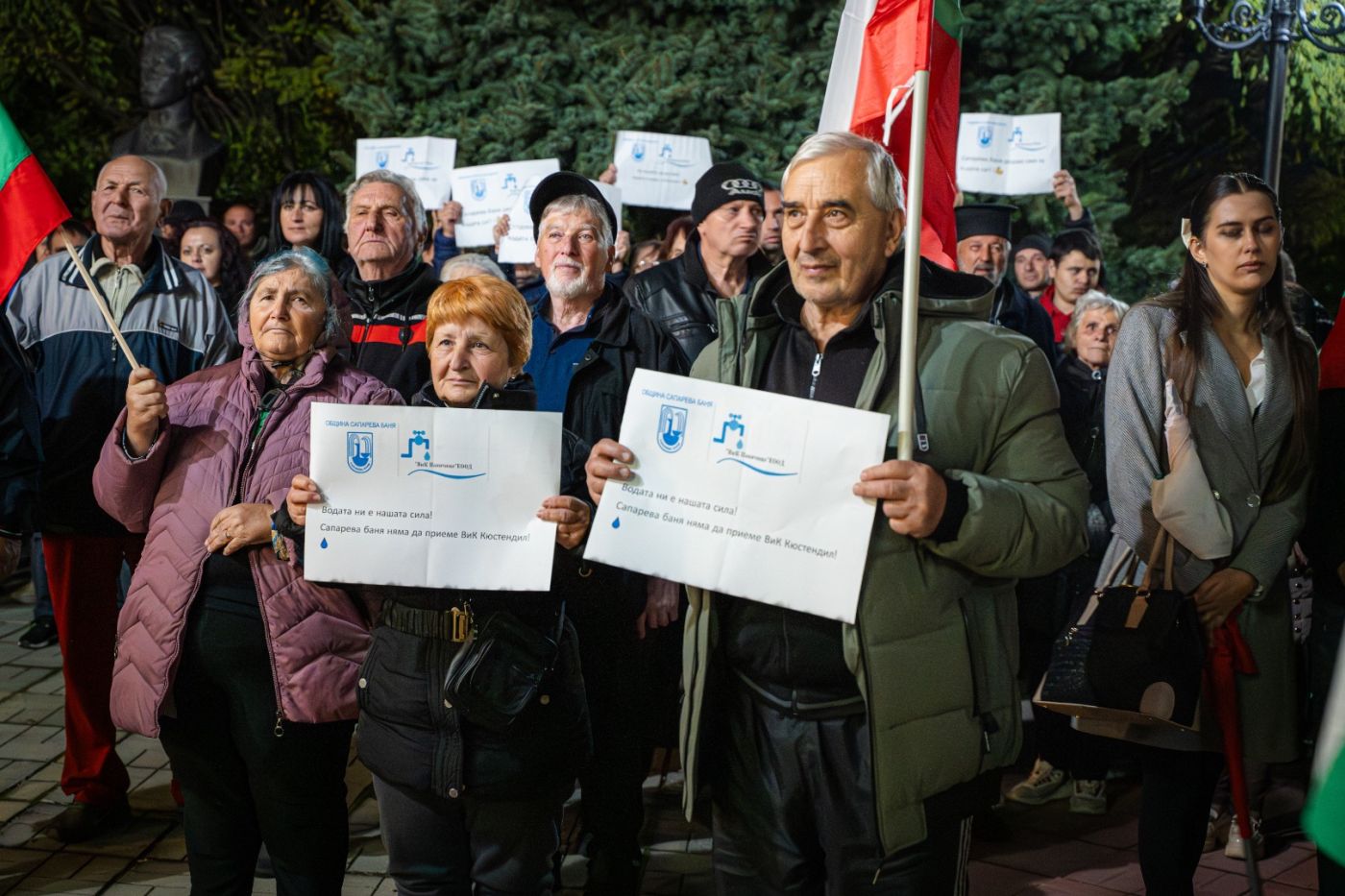 С развети знамена и плакати с послания- “Водата е нашата сила”, “Сапарева баня няма да приеме ВиК-Кюстендил”, “Сега водата после хляба”, Г-да, министри, чуйте нашия ВиК”,протестиращите изразиха категоричното си нежелание града им да премине към Асоциацията по ВиК.