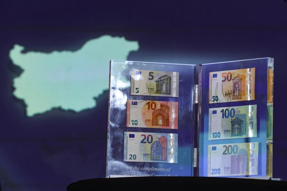 Президентът на Европейската централна банка (ЕЦБ) Кристин Лагард и управителят на БНБ Димитър Радев представитха заедно новите български евробанкноти от 5, 10, 20, 50, 100 и 200 евро. Двамата се подписаха на нея стъклената статуетка.