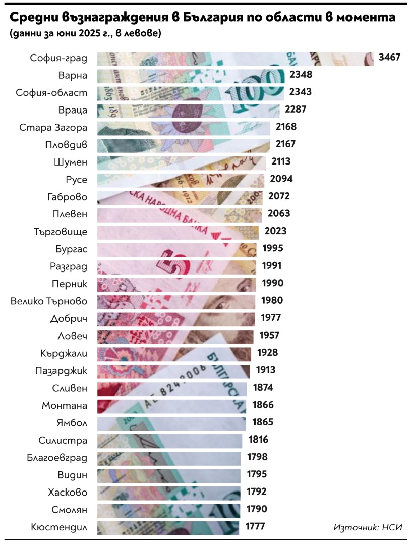 Докато в София средната заплата достига 3467 лева, в Кюстендил тя е едва 1777 лева – повече от два пъти по-ниска. Тази разлика ясно очертава тенденцията България да се движи на две икономически нива – с бързо растящи градове и области, които все по-трудно настигат водещите.