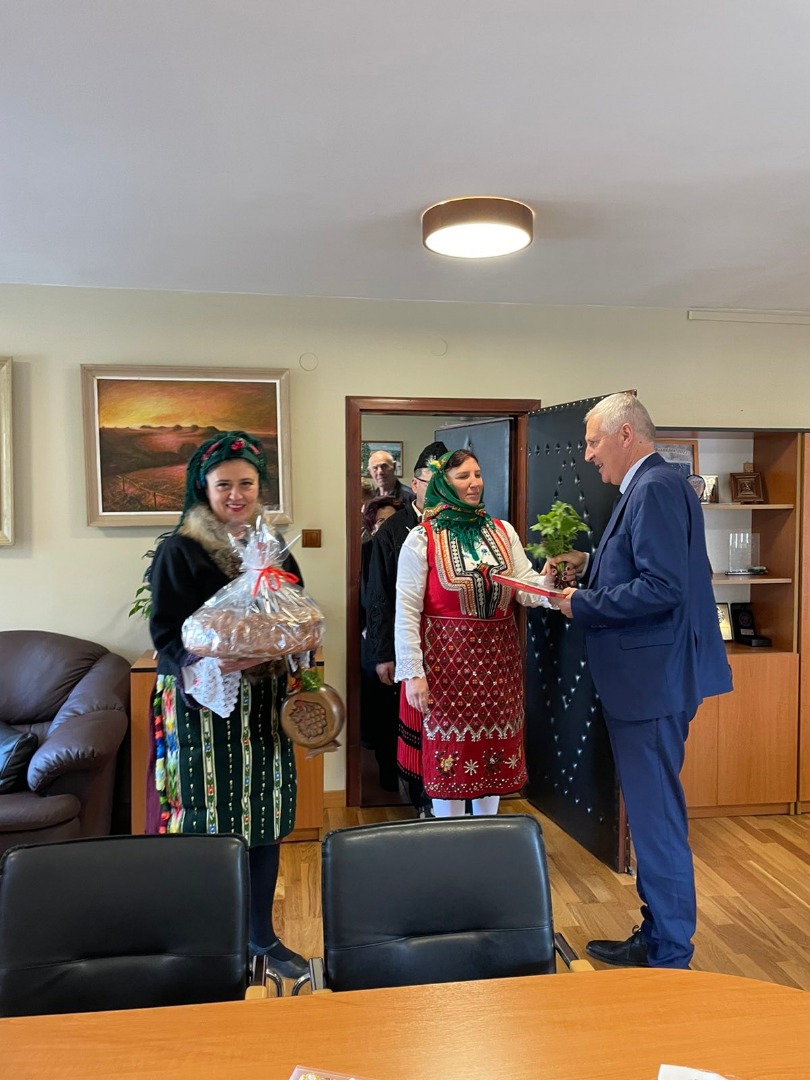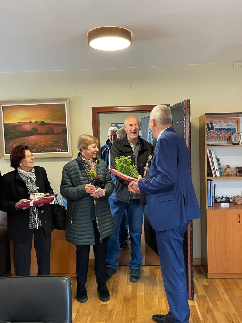 В четвъртък представители на юбилярите поканиха кмета и съпругата му Ирина Герчева със сладка питка, червено вино, кумска ракия и китка здравец. Кметът с удоволствие прие поканата, изразявайки радостта си да сподели този тържествен момент с двойките.