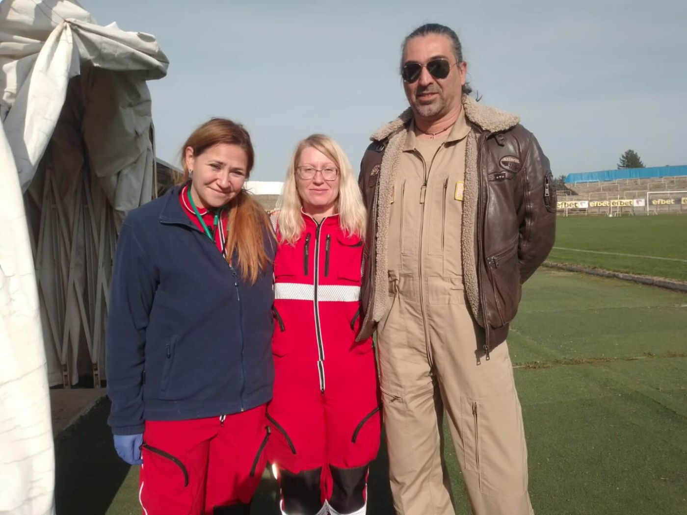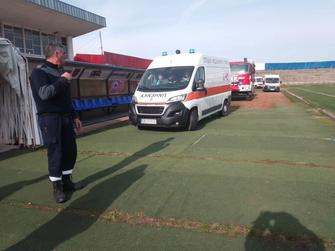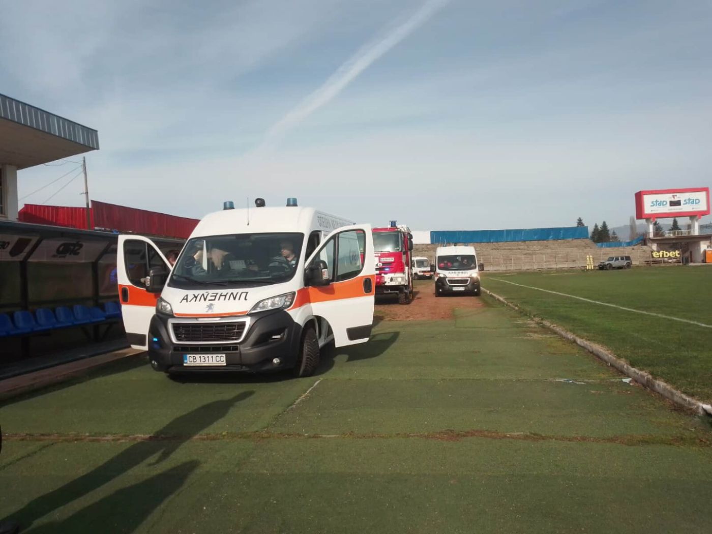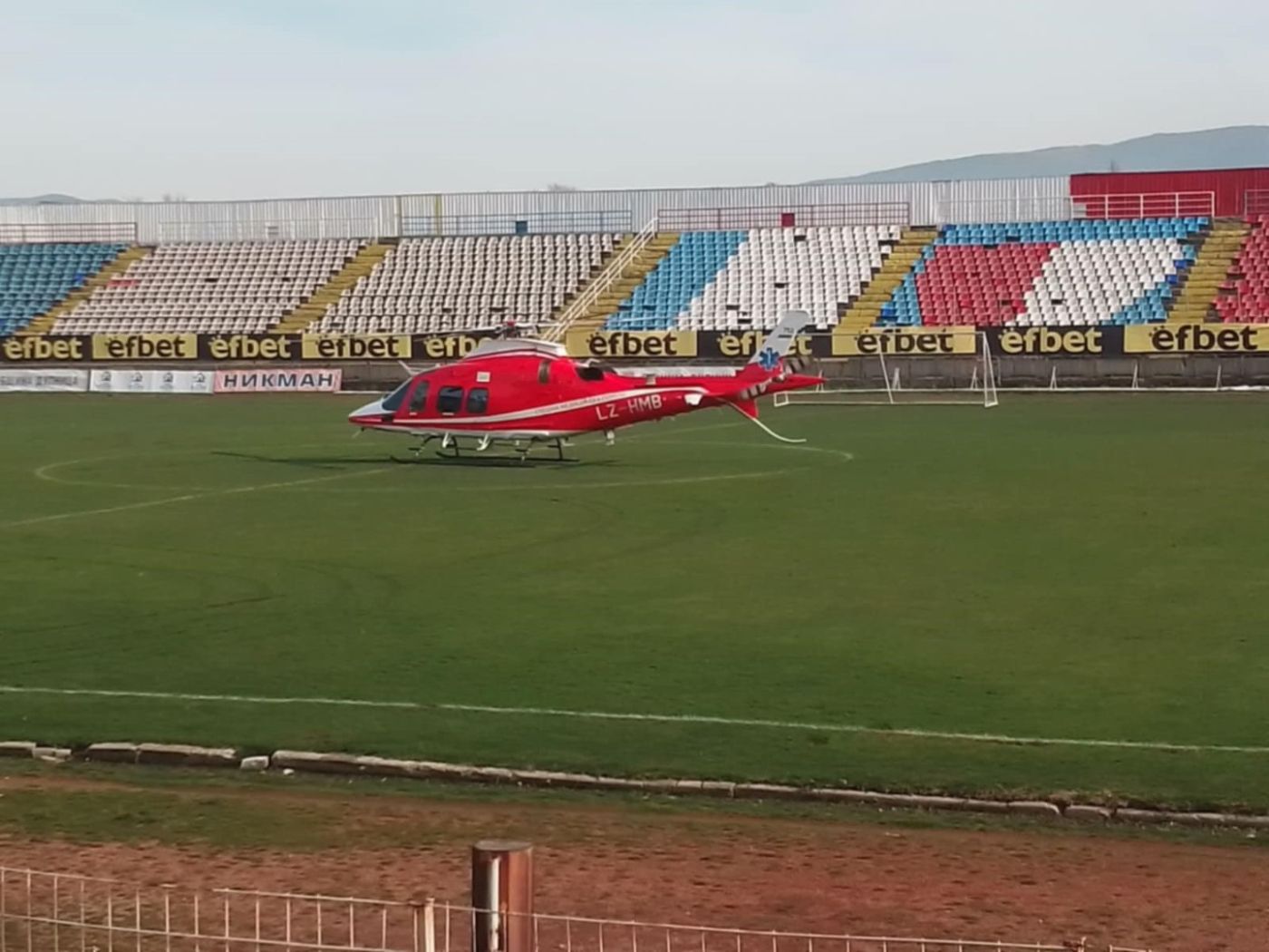 44-годишният мъж с аневризма на мозъка бе докаран от екип на Спешна помощ в Благоевград на стадион “Бончук“, където го чакаха медици от столичната клиника “Св.Анна“, на които пълно съдействие оказаха екип на Спешна помощ и служители на Районното управление “Полиция“ и противопожарната охрана в Дупница.