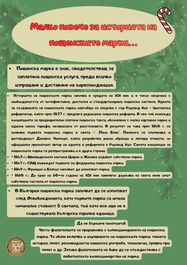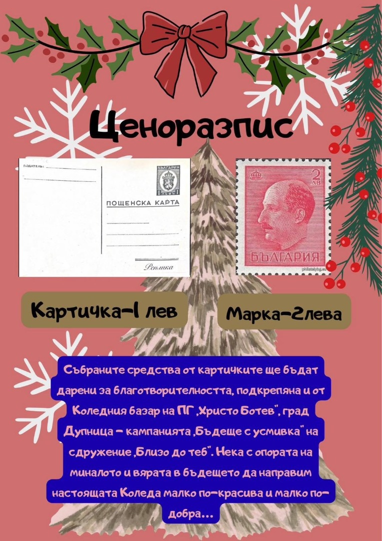 Вдъхновени от училищната инициатива за Коледна поща, наши ученици решиха да я обогатят културно и да я впрегнат в помощ на нуждаещите се. Учениците от 12 “В“ клас Мартин Ризов, Елена Петрова и Андрей Лумбев като инициатива на клуба по история с ръководител г-жа Анелия Андонова решиха да внесат още повече творчески пламък в коледните дейности на училището. Те изработиха реплики на пощенски картички от 40-те години на миналия век по времето на Царство България. Картичките са с номинал 1 лв. Към тях освен това обаче вървят и автентични марки "Редовни II (Цар Борис lll)" от 1940 или 1941 г. Марките са с номинал 2 лв. Всяка марка е пътувала и има печат от дадения град в България. Освен това учениците изработиха и информационно табло на инициативата, което дава сведения за конкретните картички и марки, както и за историята на пощенските марки като цяло. Идеята на всичко това е учениците да могат да закупуват картички за Коледната поща директно в гимназията, като по този начин затваряме целия процес на вътрешно училищно ниво, а събраните средства ще бъдат дарени за каузата, подкрепяна и от Коледния базар - кампанията "Бъдеще с усмивка" на сдружение "Близо до теб", която е в помощ на децата със специални образователни потребности“, съобщават от училището.
