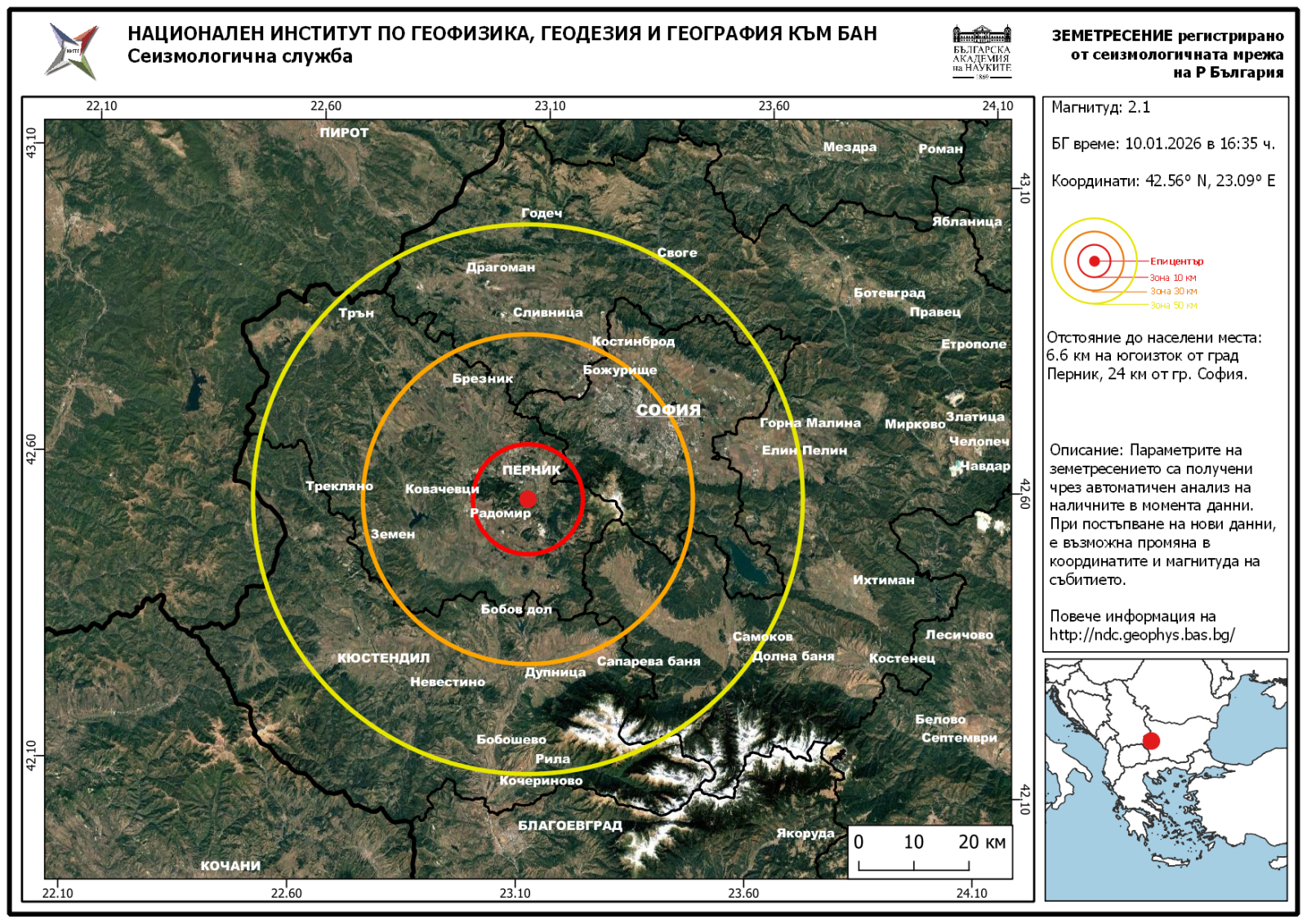 Земетресение с магнитуд 2,1 по скалата на Рихтер бе регистрирано край Перник, сочат данните на Националния институт по геофизика, геодезия и география към БАН.