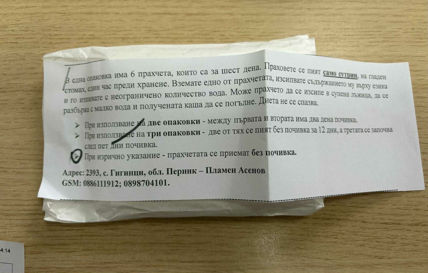 Върху прахчетата има посочен адрес и контакт в брезнишкото село Гигинци. Според схемата на илача, съдържимото се приема само сутрин и на гладно в продължение на 6 дни. Продуктът може да се взема директно или предварително разбъркан в малко количество вода. След първоначалния курс следва почивка. Може да се повтори в продължение на 12 дни, а при “при изрично указание” курсът може и да не спира. От упътването не става ясно кой следи за оздравителния процес. Посочено е, че при използването на праховете не е необходимо спазването на диета от страна на заболелия.