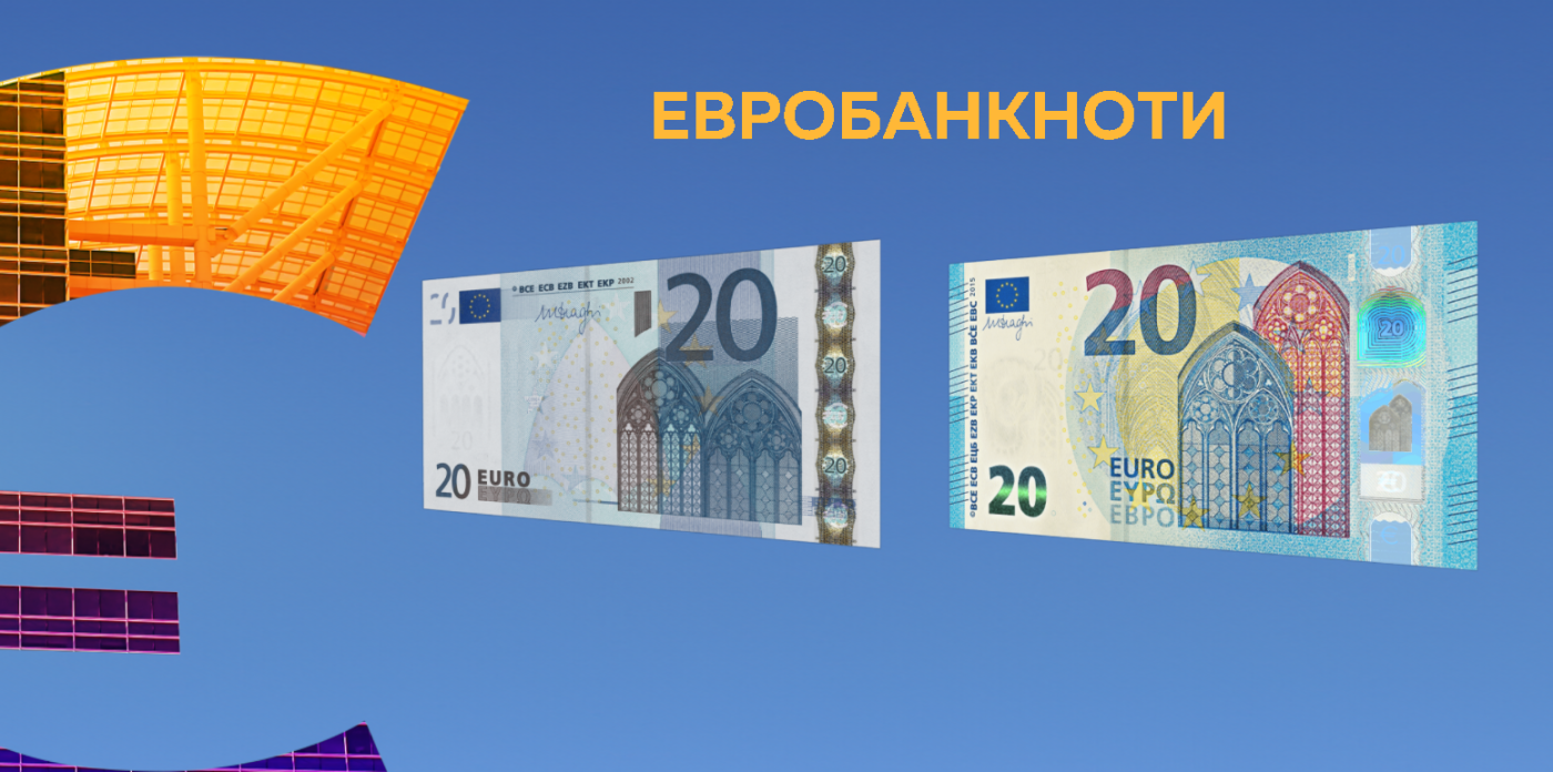 Първите евробанкноти, които циркулират от началото на века, имат архитектурни мотиви, символизиращи различни епохи от европейската история. Съдържат основни защитни елементи като воден знак, нишка и холограма. Тук “евро“ е изписано на латиница и на гръцки.