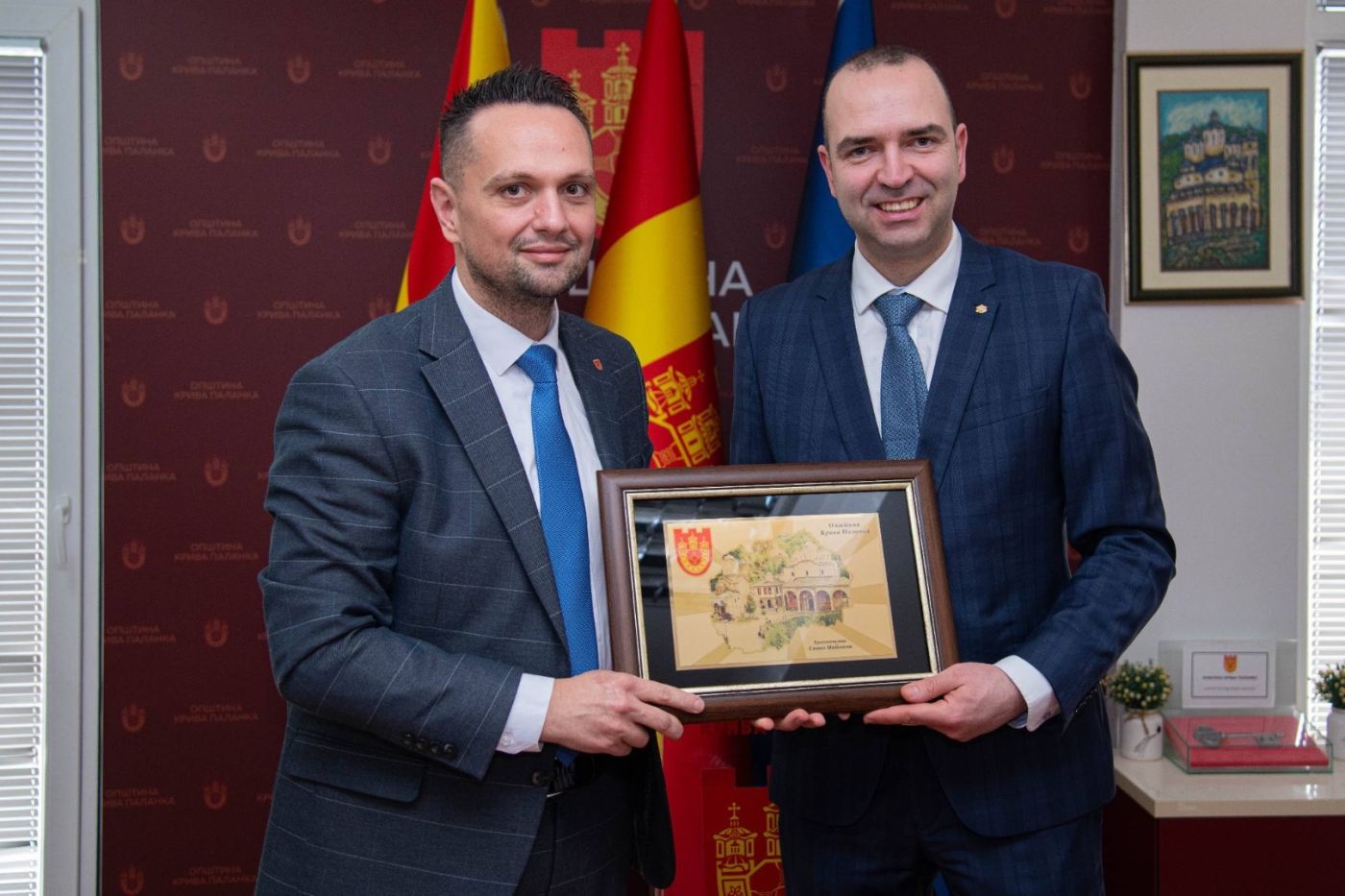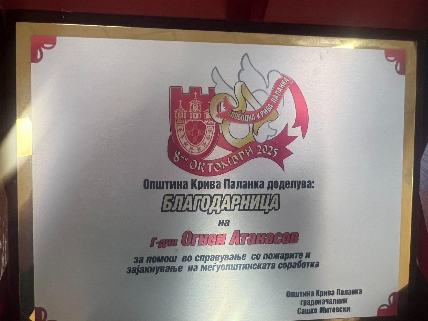 В знак на дълбока признателност за проявената солидарност и самоотверженост, кметът на Община Кюстендил инж. Огнян Атанасов бе удостоен с благодарствен плакет от своя колега – кмета на Община Крива Паланка Сашко Митовски. Отличието е признание за личната ангажираност и незабавната реакция на кюстендилския градоначалник по време на опустошителните пожари, които през юли миналата година застрашиха домовете и горите в съседната ни държава.