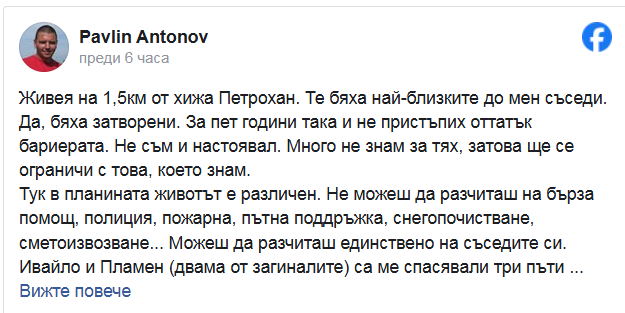 Близък съсед на мъжете, погубени при трагичния инцидент край хижа “Петрохан“, сподели емоционално свидетелство за човешката страна на случая. Живеещият на едва 1,5 км от мястото на събитието разказва в социалните мрежи, че в суровите условия на планината, където държавните служби са труднодостъпни, е разчитал изцяло на тяхната подкрепа. По думите му Ивайло и Пламен са го спасявали три пъти, включително при тежка хипертонична криза през преспите и след сериозна травма на гръбнака.