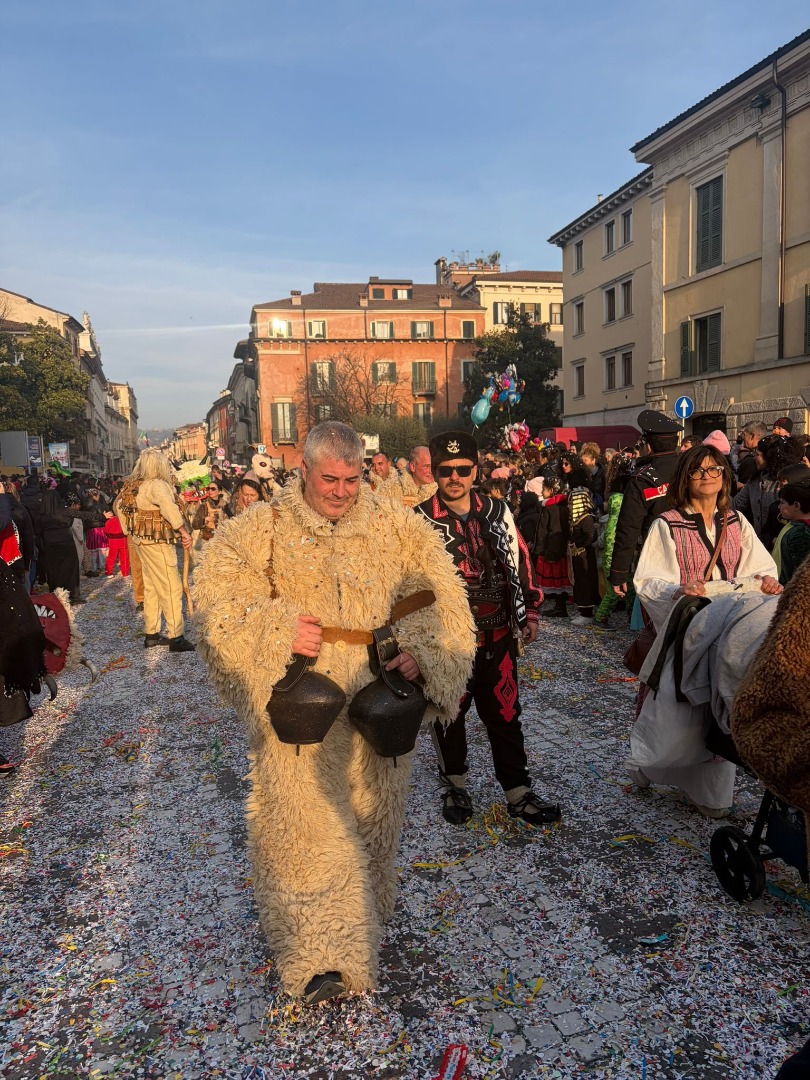 “Нашата група бе създадена от мен през 2024 г. и имаме 2 участия през 2025 г. в карнавалните дефилета в град Верона. Едното от тях е най -пищният празник в града, а именно “Гран Баканал дел Гноко“, а другото, не по –маловажно, в квартал “Санта Лучия“. Тази година също взехме участие в “Гран баканал дел Гноко“. Участниците в нашата група са от всеки край на Северна Италия, идват от Тоскана, Милано, Пиаченца, Феррара. И тази, както и миналата година, дойдоха и наши приятели от село Джерман, за да ни подкрепят, за което съм им безкрайно благодарен“, разказа Мирослав Димитров. Той живее във Верона от 18 години и работи като доставчик на алкохолни и безалкохолни напитки.