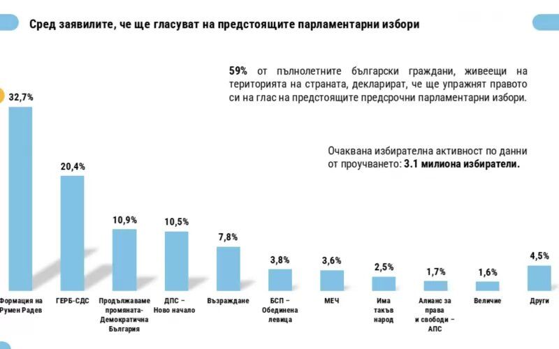 В следващото народно събрание 7,8% от заявилите, че ще гласуват избиратели вкарват Възраждане. Близо до чертата остават БСП с 3,8% и МЕЧ с 3,6 на сто.
