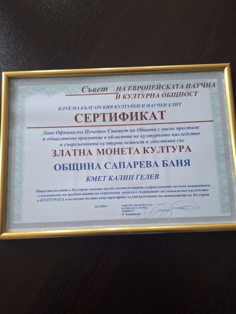 Община Сапарева баня официално бе вписана в престижния списък на културните лидери в България. Съветът на европейската научна и културна общност към Клуба на българския културен и научен елит присъди на общината отличието “Златна монета – Култура“, придружено от официален сертификат и почетен статут.