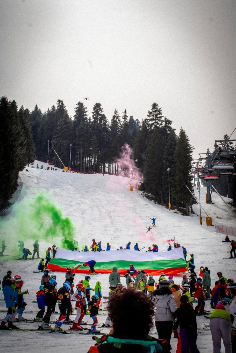 Истинската кулминация настъпи на писта “Рила“, където десетки скиори и сноубордисти се спуснаха с огромен трибагреник и димки в цветовете на националния флаг. Атмосферата бе допълнена от мощните гърмежи на черешови топчета, подготвени от Клуба за историческо оръжие “Чакър войвода“.