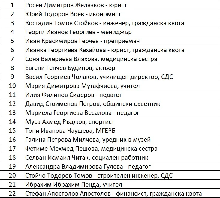 В списъка на кандидатите са включени юристи, педагози, инженери и представители на местната власт, с цел баланс между големите общини като Петрич и по-малките населени места. Листата включва и представители на гражданската квота и на коалиционния партньор СДС – директорът на Трето ОУ Васил Чолаков и инженерът Стойчо Томов.