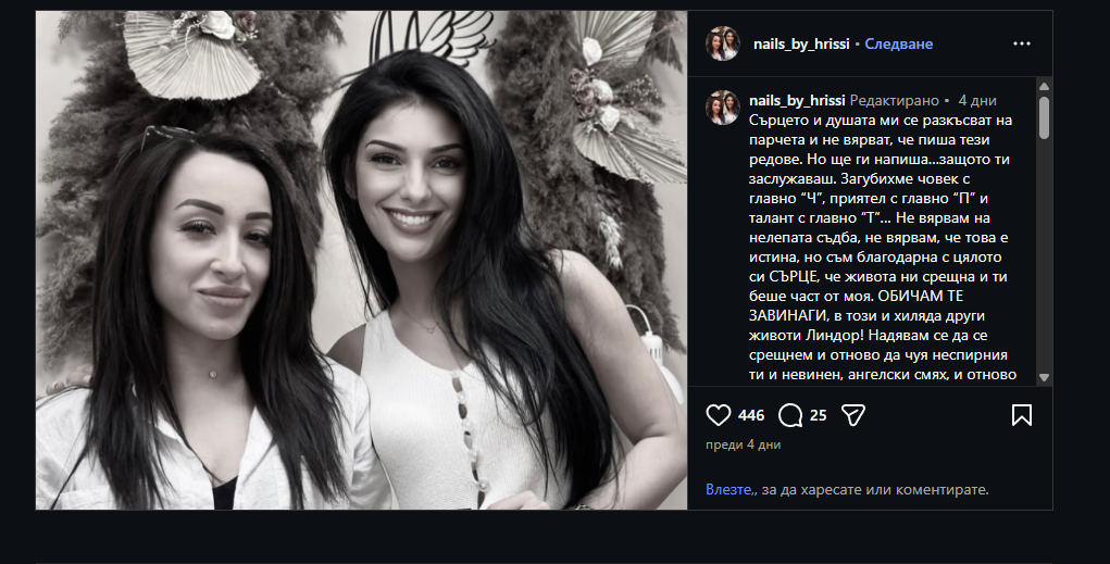 “Сърцето и душата ми се разкъсват на парчета и не вярват, че пиша тези редове. Но ще ги напиша… защото ти заслужаваш. Загубихме човек с главно “Ч“, приятел с главно “П“ и талант с главно “Т“. Не вярвам на нелепата съдба, не вярвам, че това е истина, но съм благодарна с цялото си сърце, че животът ни срещна и ти беше част от моя. Обичам те завинаги, в този и хиляда други животи, Линдор. Надявам се да се срещнем отново и да чуя ангелския ти смях… Завинаги ще си с нас и ще те обичаме.Линда загуби живота си след поставяне на хиалурон в гърдите при дупнишкият лекар д-р Борис Дашков.”, твърди в свой пост близка за починалата.
