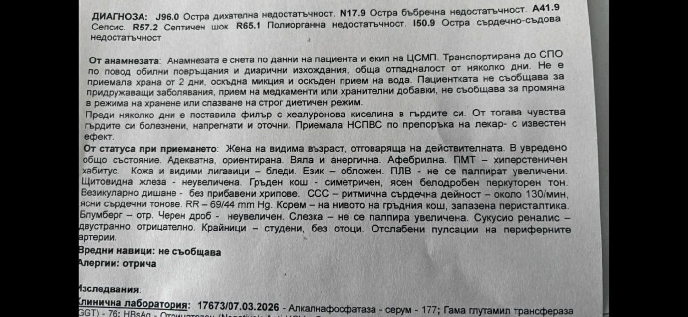 Според медицинската епикриза пациентката е постъпила с признаци на остра дихателна и бъбречна недостатъчност, сепсис и полиорганна недостатъчност, които са довели до фаталния изход.