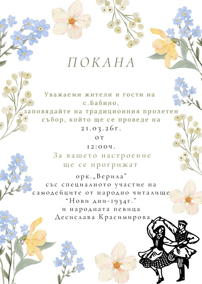 Бобовдолското село Бабино се подготвя за своя традиционен събор, който тази година ще се проведе на 21 март. Празненството е посветено на настъпването на пролетта и обещава богата фолклорна програма за всички присъстващи.