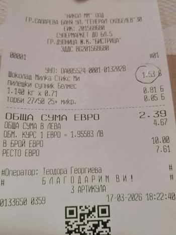 “На 17 март детето ми, което е ученик в пети клас, си е купило от лавката в ОУ “Неофит Рилски“ шоколад “Милка“ на цена от 3, 20 евро. Направих проверка в няколко магазина, намиращи се в центъра на града и в Горна махала, от които купих от същите шоколади. В тези магазини цените на същите шоколади струват от 1, 40 до 1, 53 евро. Уведомих директора на училището Бистра Стойкова. За да се увери в правотата ми, тя също бе закупила от този вид шоколад от магазин, намиращ се извън училището, на много по-ниска цена. Уведомихме и Весела Лефтерова - представител на ЕТ “Милчо Лефтеров – МЕЛ – Ени Лефтеров“ – фирмата, зареждаща лавката.