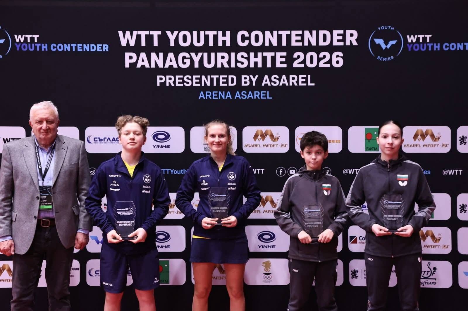Йоан Величков триумфира като шампион на WTT Youth Contender Panagyurishte 2026, съобщиха от дупнишкия клуб по тенис на маса “Марек Дигеста спорт”. Стефан Бончев спечели бронзов медал в индивидуалната надпревара до 15 години и завоюва сребро в смесените двойки, а най-младият представител на отбора Николай Иванов също остави отлични впечатления със своето представяне.