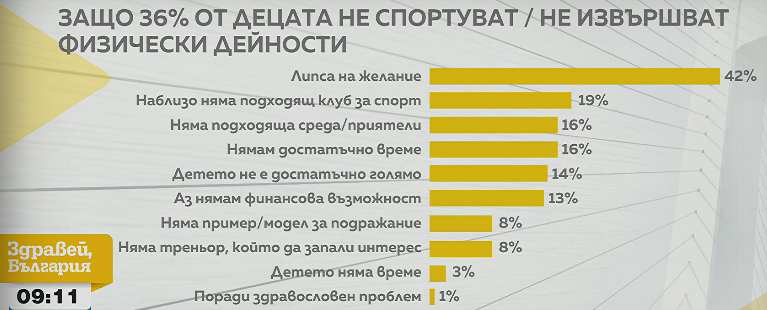 Според изследването 36% от децата не спортуват, като основната причина – при 42% от тях, е липсата на желание. По думите на д-р Александрова това е пряко свързано със съвременния начин на живот. “Децата имат нужда да се движат, но ако ги оставим без насока, те избират най-лесното – телефоните, социалните мрежи и видеоигрите“, обясни тя.