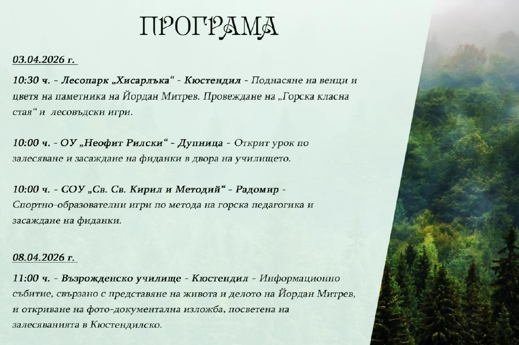 Регионалната дирекция по горите – Кюстендил кани гражданите и гостите на региона на тържествено поднасяне на венци пред паметника на бележития лесовъд Йордан Митрев. Събитието, което е централна част от честванията по случай “Седмица на гората 2026 г.“, ще се състои на 3 април от 10:30 часа в лесопарк “Хисарлъка“. Директорът на РДГ – Кюстендил, инж. Здравчо Тодоров, отправя покана към обществеността да се присъедини към честването, което включва още провеждане на “Горска класна стая“ и интерактивни лесовъдски игри за присъстващите.