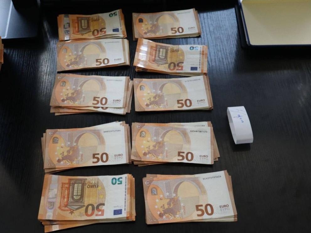 Мъжете са проследени и задържани на паркинг на голяма търговска верига. Парите - теглени в брой и тъпкани в раници.
