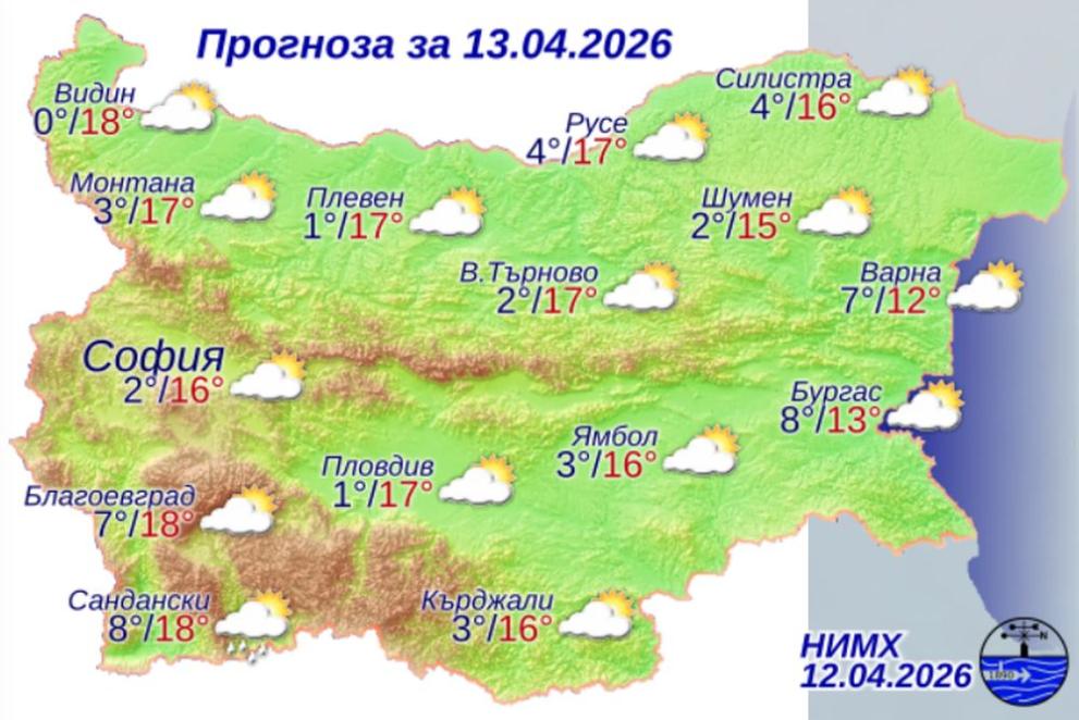 В понеделник ще преобладава слънчево време с временни увеличения на облачността. На изолирани места в крайните югозападни райони ще превали слабо. Ще духа слаб, след пладне умерен вятър от изток-югоизток. Максималните температури ще бъдат между 13° и 18°, за София – около 16°