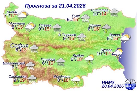 В петък и събота вероятността за валежи намалява, все пак не са изключени изолирани слаби превалявания, главно в планините. Минималните температури ще са най-ниски в четвъртък - между 1° и 6°, а дневните ще се повишат, в петък и събота максималните ще са между 15° и 20°. В неделя и понеделник времето ще бъде предимно слънчево, вятърът ще отслабне и временно ще се ориентира от юг. Ще се затопли още.
