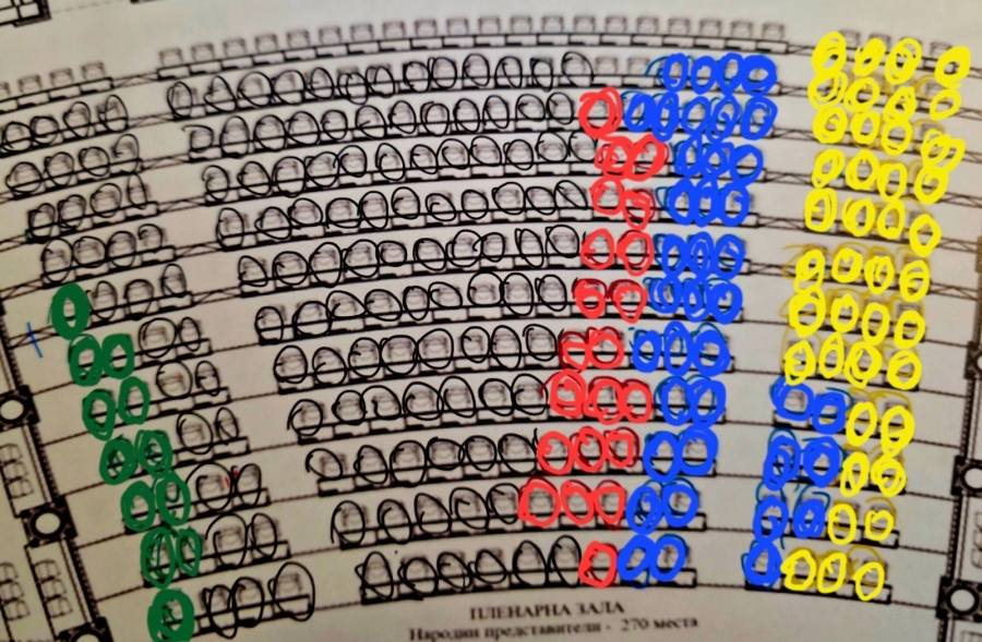 ГЕРБ и ДПС запазват позициите си в централната част на залата. Там ще бъдат разположени и народните представители на формацията на Радев, която с 131 мандата ще има най-голямо присъствие в парламента.