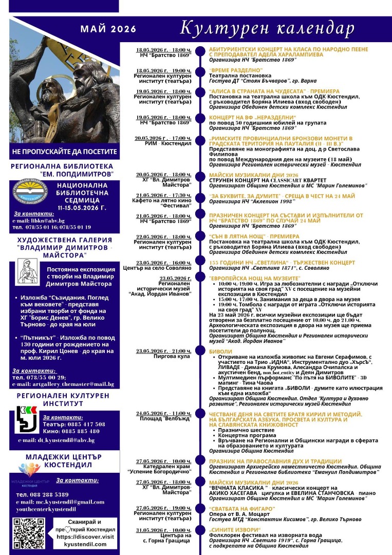 Културен календар на Кюстендил: Пълна програма за май