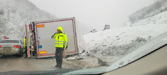 Временно е ограничено движението в участъка от км 176 до км 186 по път I-1 Лютидол – Ботевград поради аварирал тежкотоварен автомо