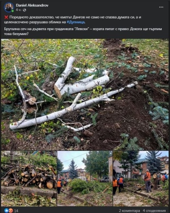 Реакциите на обществеността идват след като във вторник сутринта служители на ОП “Чистота и поддръжка на териториите за обществено ползване” към Общината изрязаха до дънер здрави дървета и растителност в района на градинката “Левски”. Действията им предизвикаха огромно възмущение и обществено недоволство.