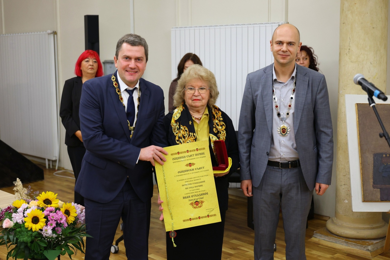 Кметът Владимиров добави, че е отдадена почит и на големия творец Иван Вукадинов, удостоен посмъртно със същото звание. "Неговото изкуство е доказателство, че силата на духа и таланта надживяват времето", каза още Владимиров. Той призова общинските съветници да продължават да вземат важните за Перник решения с отговорност.