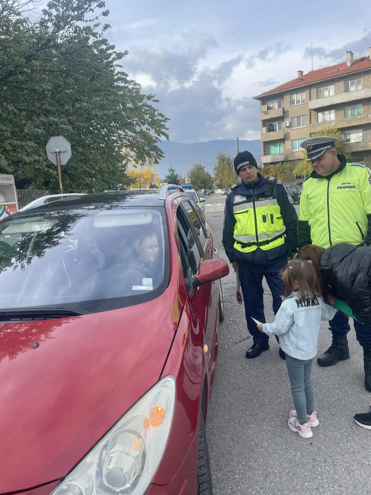 Възпитаниците на ДГ ”Еделвайс” трогнаха водачи на автомобили, като им подариха своите послания върху есенни листа, изработени от тях и педагозите им. Пожелаха на всички безаварийно пътуване и безопасно поведение на улицата.