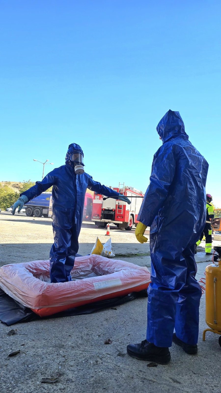 По време на учението бяха проиграни действия по спасяване на пострадали, тампониране на цистерна, гасене на електромобил и защита на критична инфраструктура.
